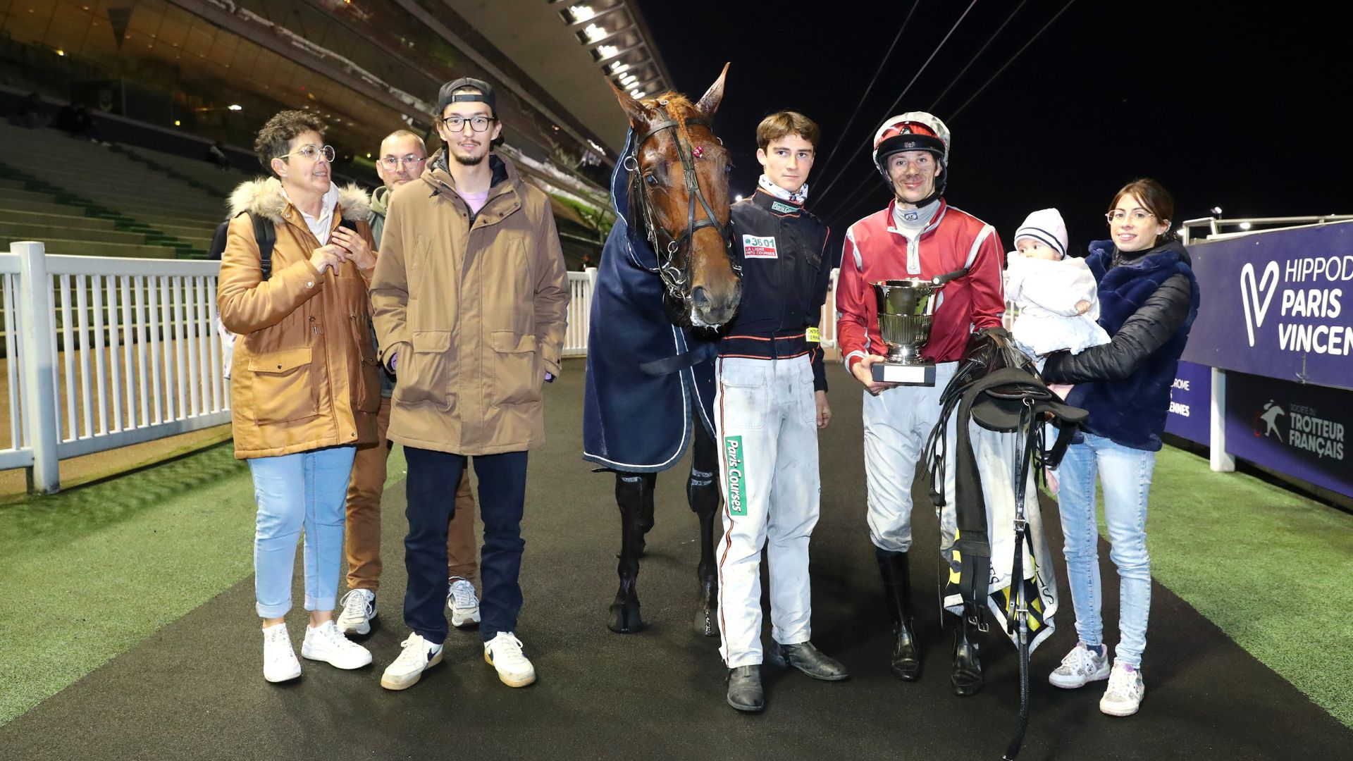 cote inférieure d'égalité, le protégé de Mathieu Mottier n'avait pas vraiment d'adversaire au "betting". Mais il en fut tout autrement sur la piste et il lui aura fallu donner le meilleur de lui-même (en tout cas avec son état de forme pour sa rentrée) afin de s'imposer comme nous l'a expliqué son mentor : "Dans la montée, je n’ai pas pu contrer Benjamin et j’ai décidé de me coucher. Je lui ai redonné une chance et ça lui a permis de revenir en final, le faisant comme un bon cheval car au moment décisif il s’est relancé. Je pense et j’espère qu’il n’était pas à 100%. Son grand objectif sera le Prix de Vincennes : il courra une fois à l’attelé avant."