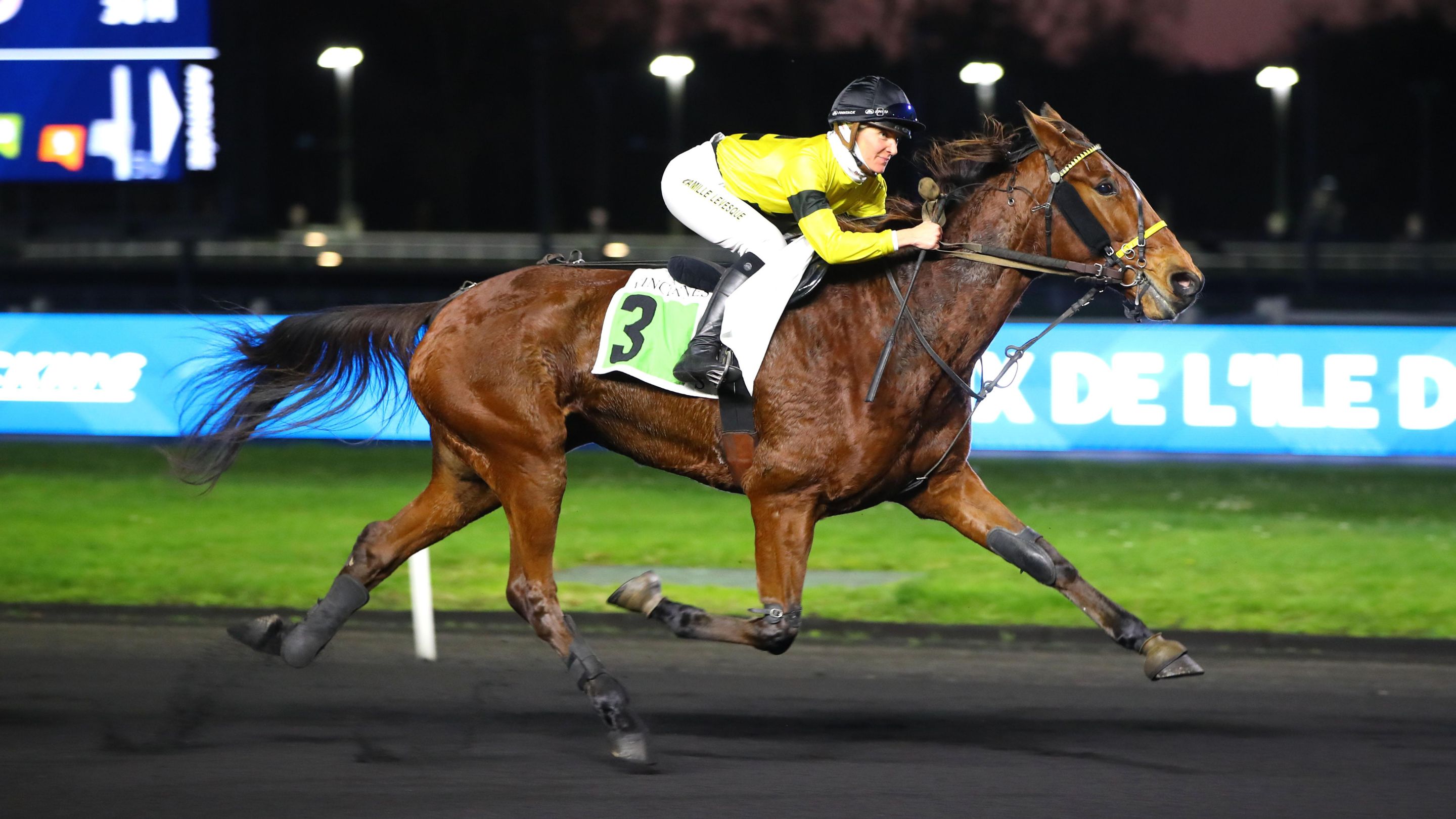 © ScoopDygaEngagée à la limite du recul du Prix de l'Île de Ré ce jeudi à Vincennes, Islamorada (Royal Dream) ne laisse à personne le soin d’imprimer le train, d’autant que les deux favoris, Eros Zola (Zola Boko) et Idéal du Rocher (Clif du Pommereux), devaient lui rendre la distance. Malgré un très bon effort final chacun, ils ne peuvent pu complètement revenir sur la jument de la famille Levesque qui signe un troisième succès consécutif sous la selle. Le sourire aux lèvres, Camille Levesque confie au micro d’Equidia Racing : "On avait décidé d’aller de l’avant pour ne pas ramener le wagon de la deuxième épaisseur. Je l’ai un peu stimulée au heat et au canter pour prendre un bon départ. On m’a laissée faire car j’avais la jument de train du premier échelon. Quand elle voit la montée, elle accélère. Elle fait ça facilement, j’en avais encore sous la pédale. Cela fait des mois qu’on pense qu’elle est en retard de gains et qu’elle devrait en avoir le double, donc je ne suis pas surprise. Niveau chrono, ce n’était pas simple de nous rendre la distance. Sa victoire ne m’étonne pas. C’est ma jument pour le meeting d’hiver, elle commence bien".