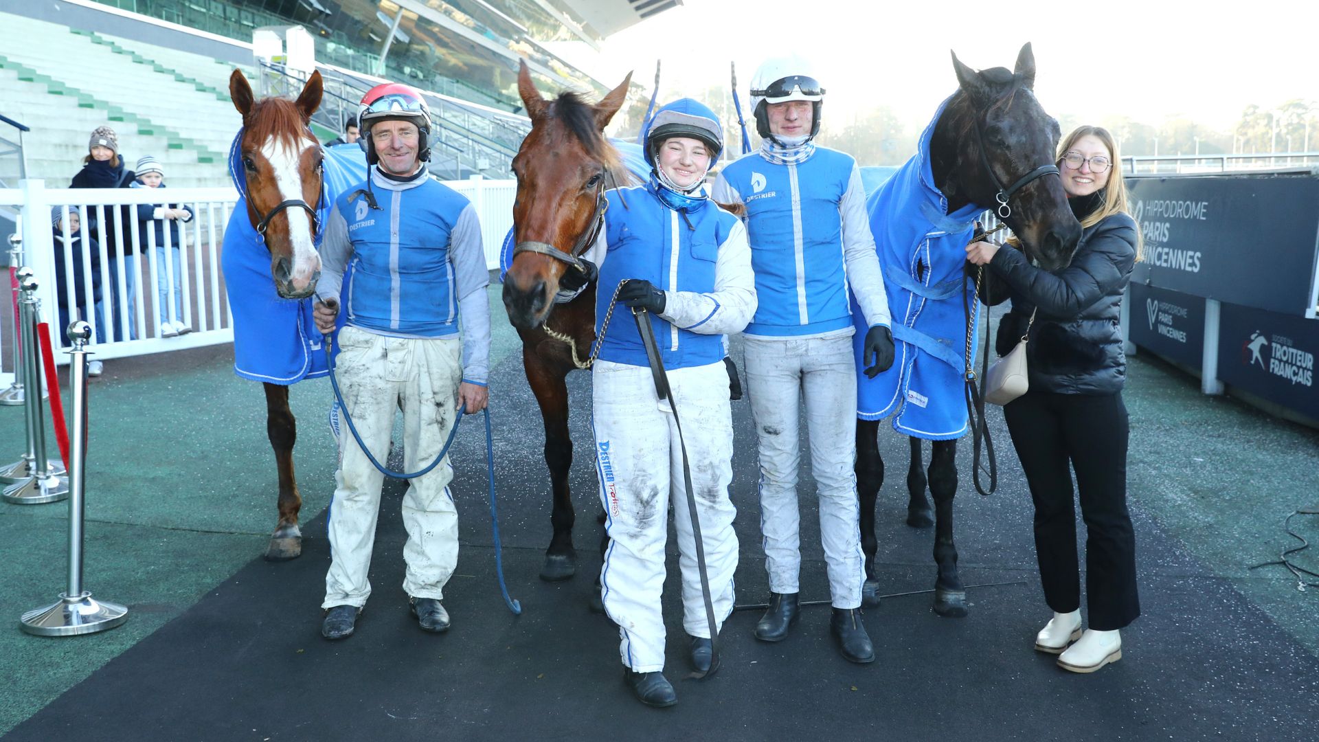 ©AprhEt un, et deux, et trois Baudouin ! L'écurie de Jean-Michel Baudouin présentait trois chevaux au départ de ce Prix de Gray, course à réclamer du jour, et ils forment le trio gagnant ! Superbe tir groupé (et rarissime en général et encore plus à Vincennes) doublé d'une première victoire sur la piste de référence pour Charlène Bancel au sulky de Koweit De Chenu (Rodrigo Jet). La jeune femme travaille au sein de l'écurie Baudouin depuis un peu plus de deux ans et remporte ici sa 4ème victoire en carrière : "C'est énorme, je n'aurais jamais pensé vivre ça un jour. On peut finir l'année tranquille... Je ne mène pas beaucoup et j'aime m'occuper des chevaux à l'écurie mais c'est une super sensation de gagner ici." Pour Gauthier Baudouin, la satisfaction est également double : "Je suis vraiment ravi que Charlène gagne sa première à Vincennes, elle le mérite. Le triplé est top même si je me rappelle que l'écurie l'avait déjà fait à Nantes dans le cadre d'une finale régionale."