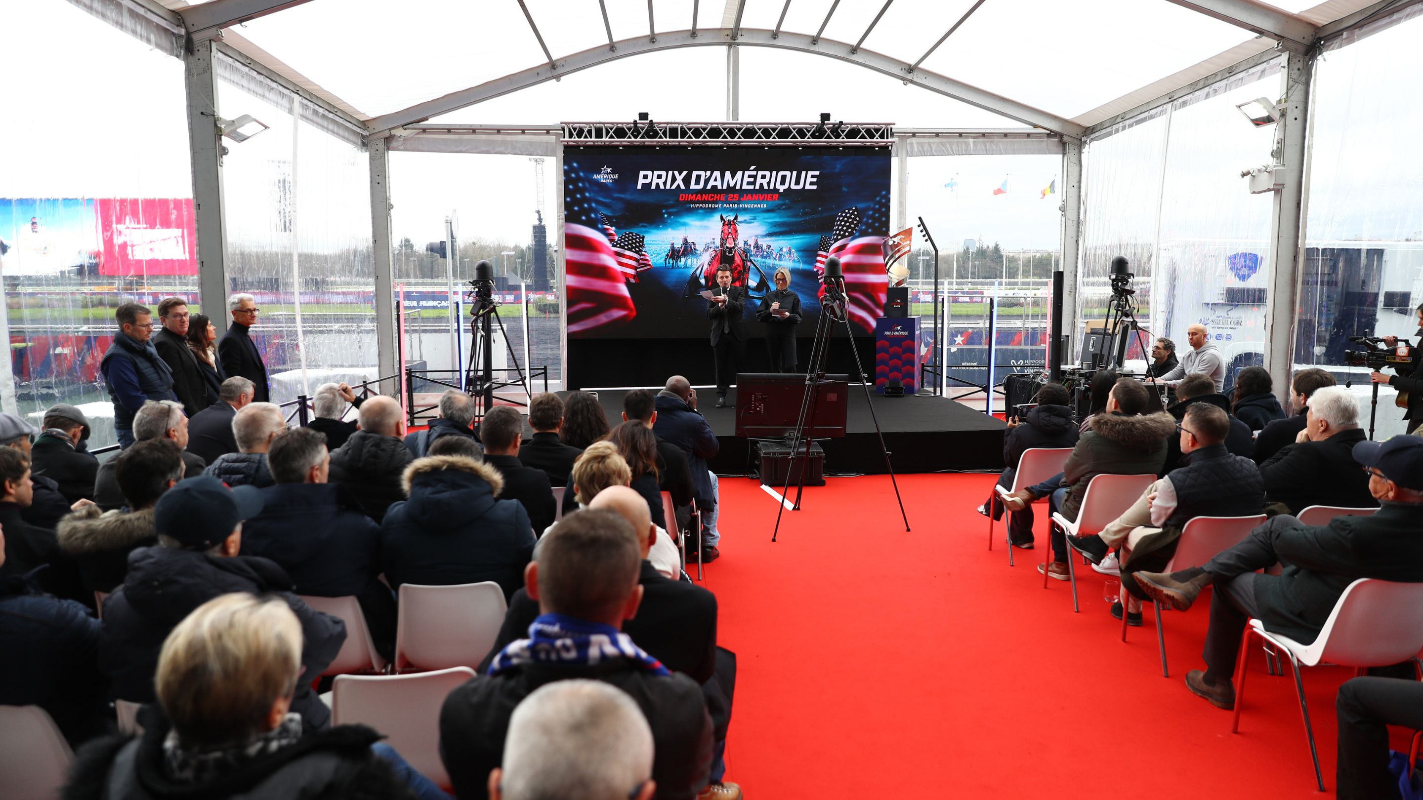 Donner une exposition encore supérieure à l'épreuve la plus convoitée de l'année à travers différentes expériences, tel est le concept du Prix d'Amérique Festival inauguré cette année. C'est dans le cadre d'une journée du vendredi relookée que s'est tenue à la mi-journée la conférence de presse dont la ligne directrice était de proposer de découvrir l'histoire de chacun des 18 concurrents. Une grosse soixantaine de média, parmi lesquels Le Figaro, France Inter ou encore RMC, a ainsi répondu à l'invitation de la SETF pour aller à la rencontre des acteurs qui, dans leur grande majorité, ont joué le jeu ou avaient enregistré des messages vidéos comme Éric Raffin et Björn Goop qui ne pouvaient pas être à Vincennes. Chacun des entourages présents a ainsi eu l'occasion de se présenter et de raconter son histoire.