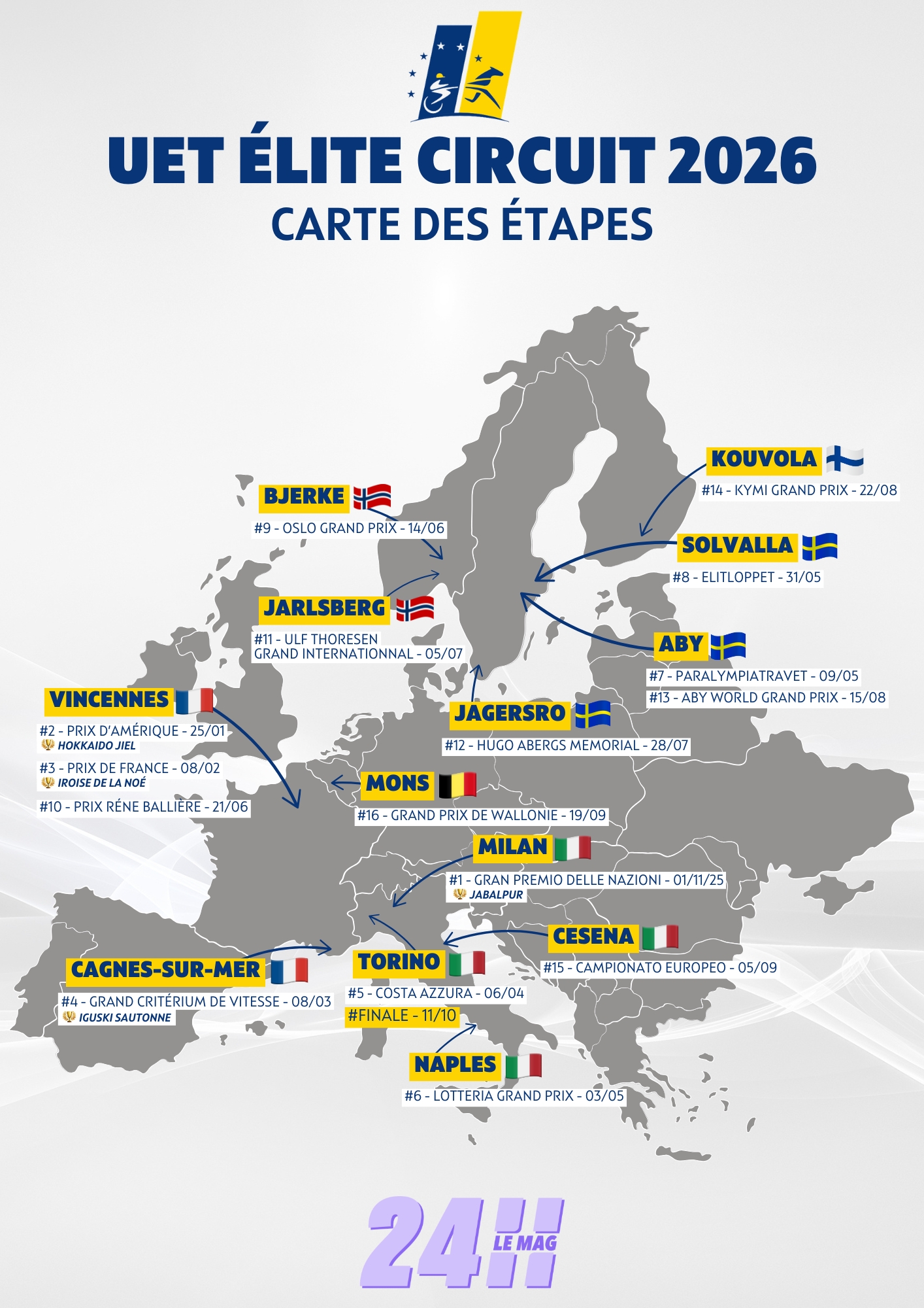 Le plan sera différent pour Hokkaido Jiel (Brillantissime) en revanche, lui qui atteint le graal ultime en remportant le Prix d'Amérique Legend Race, qui est aussi la 2ème étape de l'UET Elite Circuit. Iroise de la Noé (Tornado Bello), brillante gagnante du Prix de France Eqwin, devrait également avoir un programme franco-français qui passera par le Prix René Ballière new look (Gr.2 - 2.700m - ouvert aux hongres). Quant à Iguski Sautonne (Village Mystic), auteur de l'exceptionnel exploit de remporter le Critérium de Vitesse de la Côte d'Azur à Cagnes-sur-Mer sur 1.609m après avoir fait sien le Prix de Cornulier, toutes les options lui semblent ouvertes. Monstre de vitesse, comme il l'a prouvé encore dimanche sur la Côte d'Azur en établissant le 2ème meilleur temps de la course suite à un départ canon, le protégé de Matthieu Abrivard a une superbe année à réaliser. Engagé dans sa saison de monte au Haras du Rocher, pressenti pour tenter de garder son titre dans le Prix de l'Atlantique à Enghien (qui ne fait pas partie de l'UET Elite Circuit), il aura ensuite le choix des armes : nul doute qu'il fera l'objet d'une sollicitation des organisateurs de l'Elitloppet 2026 (31 mai) que Matthieu Abrivard aura tout loisir d'accepter ou pas, d'autant que le changement de format du Prix René Ballière rebat complètement les cartes le concernant, lui qui est beaucoup plus performant avec un départ lancé en comparaison avec le départ volté.