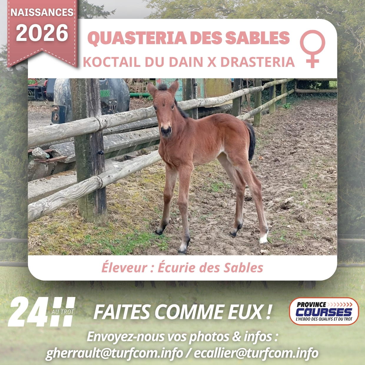Pour sa première venue sur l’hippodrome de Feurs, David Thomain s’impose d’entrée. Sur le podium, le driver lauréat s’est exprimé : "C’est une pouliche délicate mais avec beaucoup de moyens. Elle a gagné plaisamment." Doublement étoilée par Province Courses L’Hebdo lors de sa qualification le 2 septembre à Caen, en 1’18'', alors entraînée par Thibault Lamare, New Grass a été élevée par Sébastien Guarato, qui l’a ensuite présentée aux ventes Arqana de yearlings sélectionnés en 2024, où elle a été acquise pour 120.000 € par l’agence Thomas Bernereau. Elle défend aujourd’hui les couleurs de Jean-Pierre Micholet, en association avec l’écurie Gaël et Sébastien Guarato.